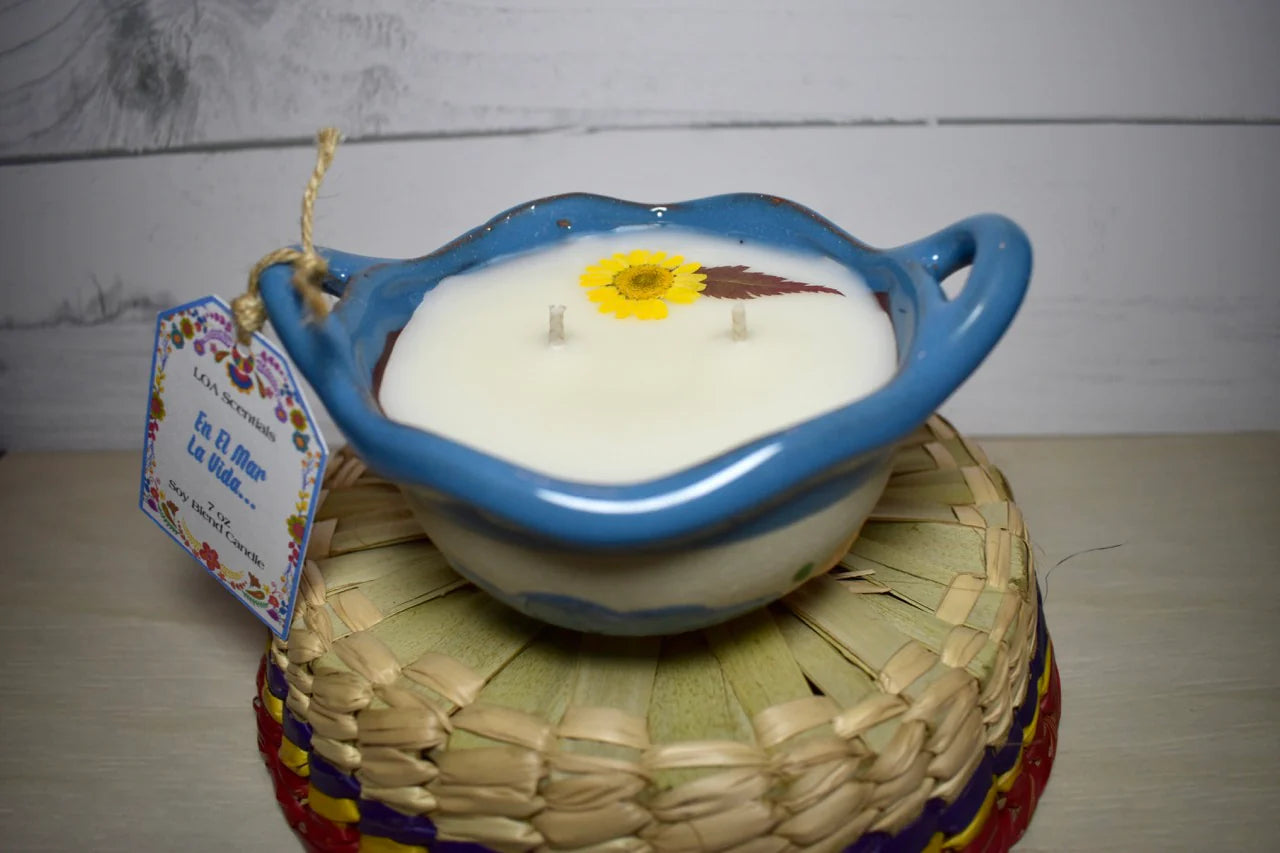 Each Cazuelita is handmade, imported from Mexico and poured in CA. With your choice of scent: En El Mar, you'll get a beautiful uniquely crafted Cazuelita design that will surround you in a pleasant nostalgic smell.